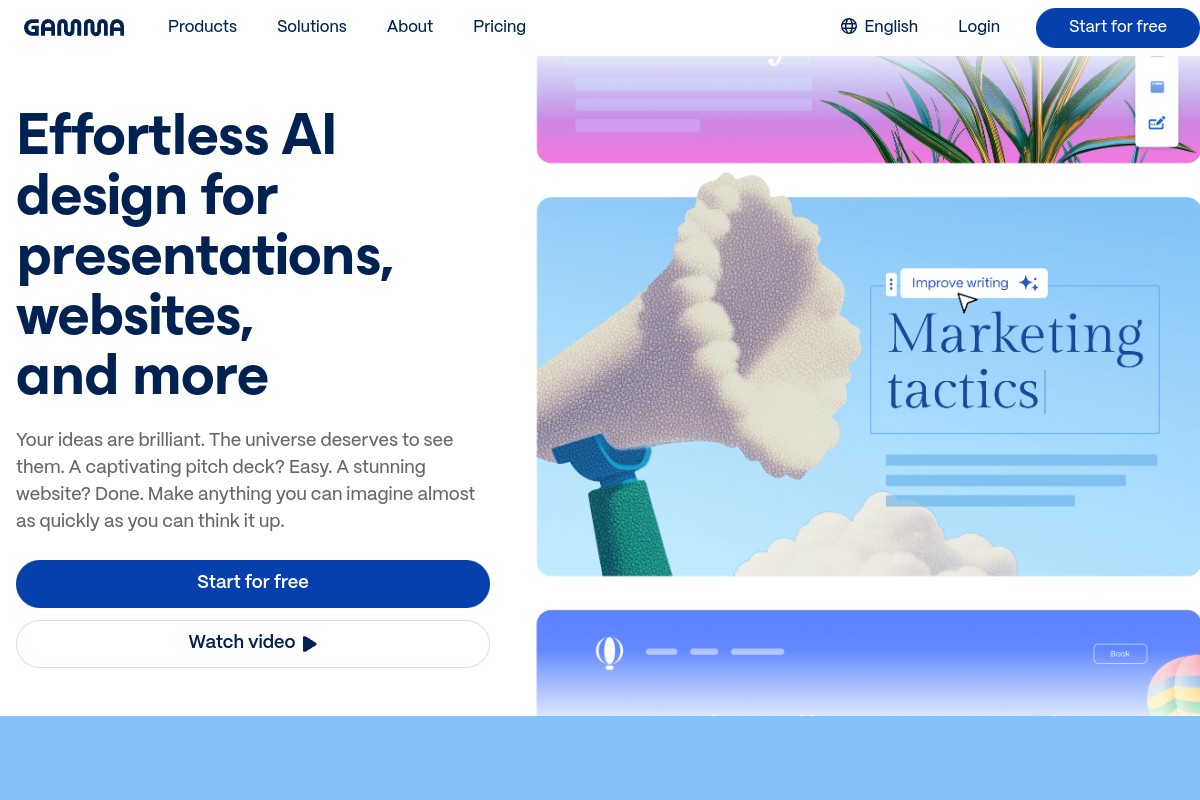 Gamma is an AI-powered platform that revolutionizes content creation by enabling users to quickly generate presentations, documents, and webpages. It streamlines the design process, allowing anyone to produce professional-looking material efficiently.