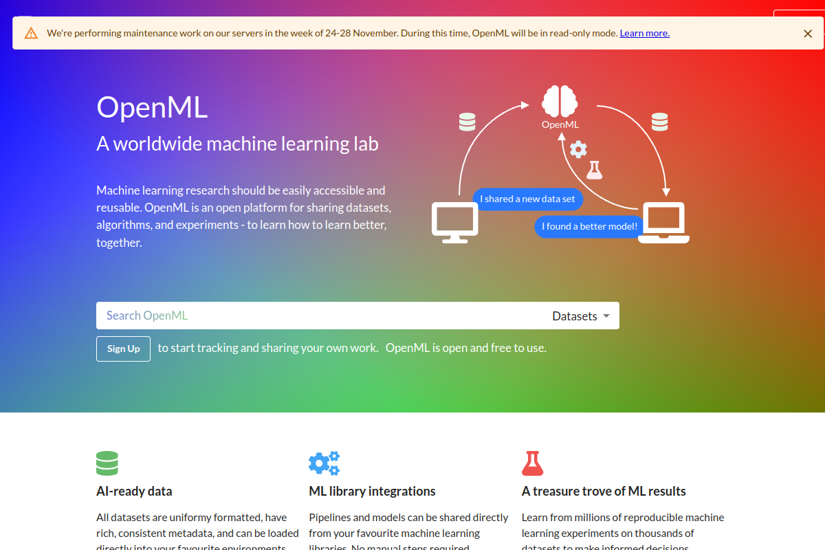 | OpenML Platform | Free | Access to all datasets, algorithms, tasks, and experiment results; API access for Python and R; ability to upload and share work; participation in the open science community. | Best for researchers, data scientists, and students seeking a collaborative, open-source platform for machine learning research and sharing. |